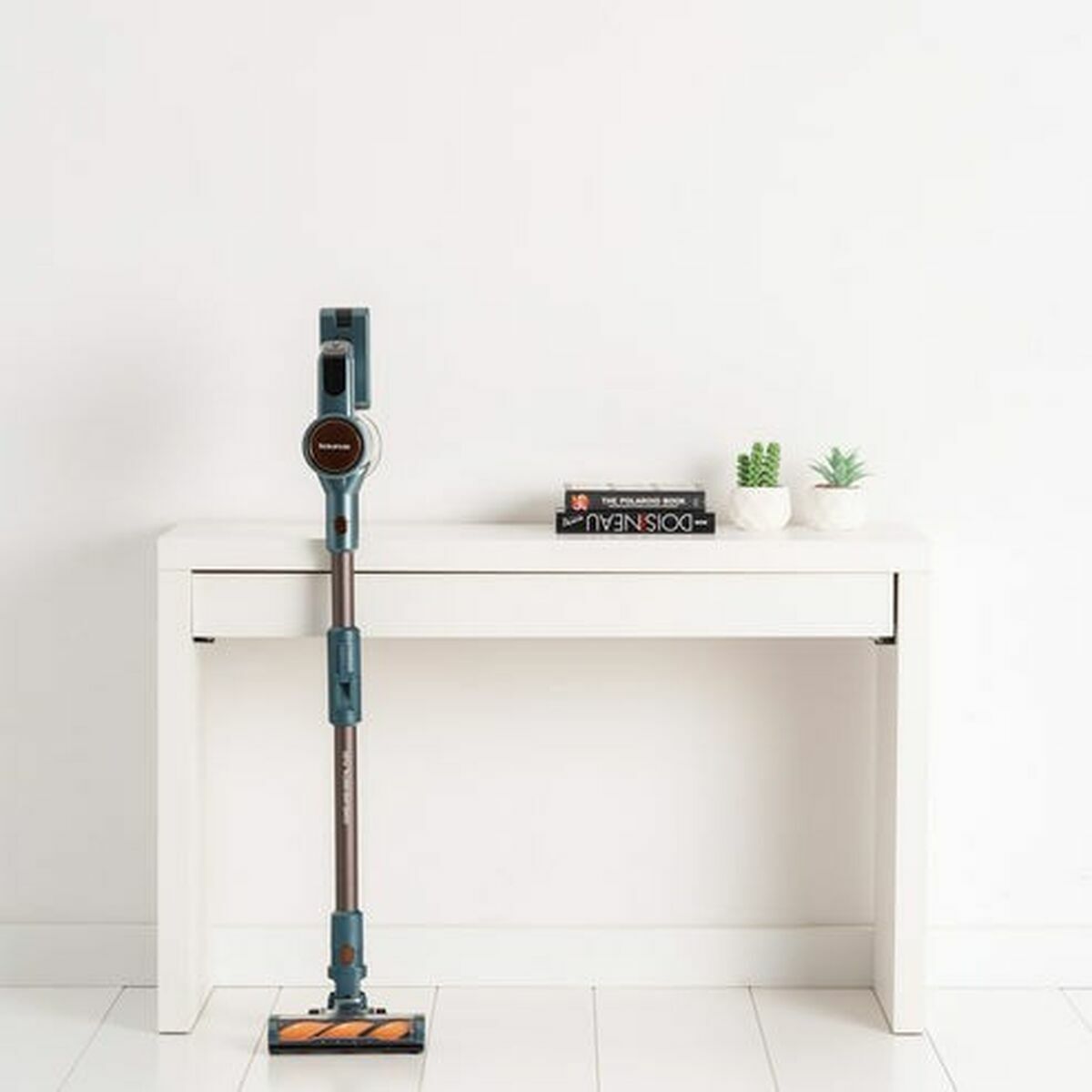 Su articulación de 180º y posición parking facilitan el uso y guardado. Incluye soporte para colgar en la pared, optimizando el almacenamiento de accesorios y del aspirador.