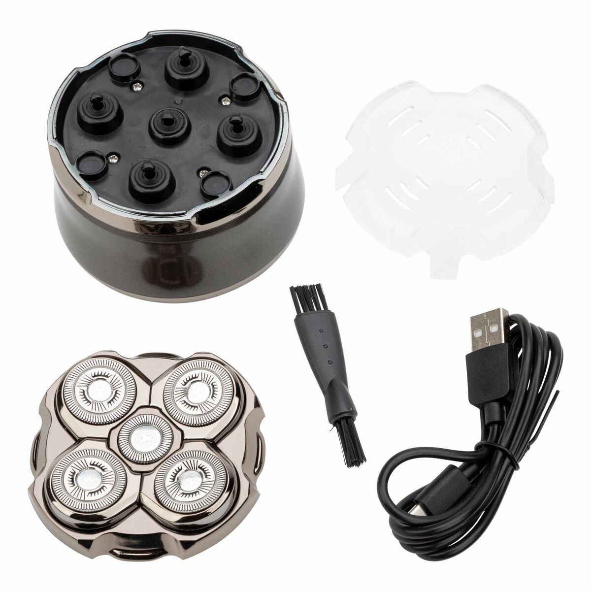 - Accesorios incluidos: cepillo para limpieza de cuchillas, cable USB y tapa protectora.
