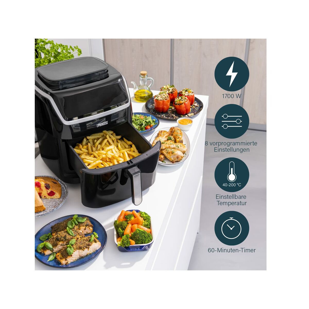 Freidora sin aceite + vaporera de Princess, rejilla de vapor, cesta para la freidora, recetario, manual