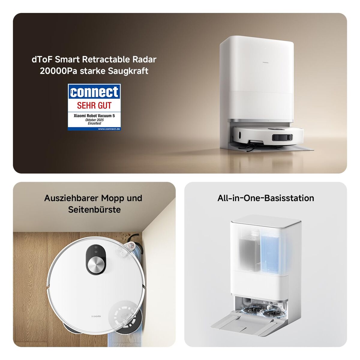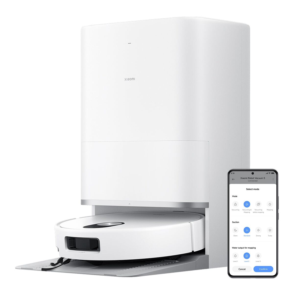 Xiaomi 5. Tipo de depósito: Sin bolsa, Color del producto: Blanco, Forma: Alrededor. Capacidad de polvo (base): 4 L, Tipo de cepillo: Cepillo de rodillo y cepillo lateral, Tipo de superficies admitidas: Alfombra, Suelo duro. Tecnología de batería: Ión de litio, Capacidad de batería: 5200 mAh, Tiempo de funcionamiento: 140 min. Diámetro: 35 cm, Altura: 88 mm, Peso: 3,75 kg