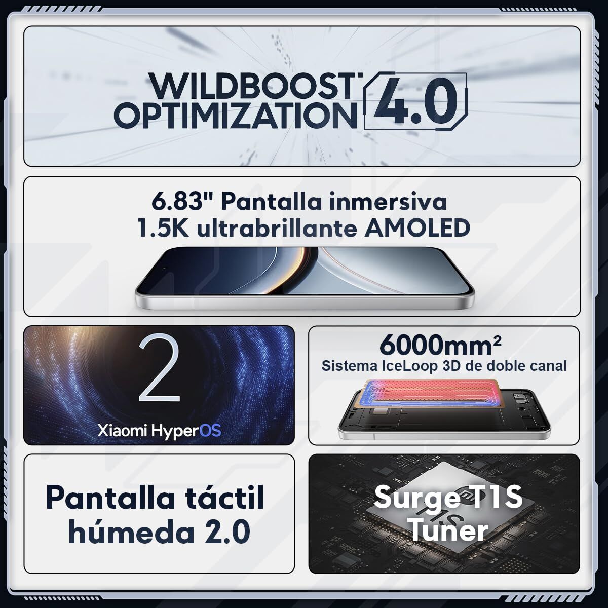 POCO F7 5G. Diagonal de la pantalla: 17,4 cm (6.83"), Resolución de la pantalla: 2772 x 1280 Pixeles. Familia de procesador: Qualcomm Snapdragon, Modelo del procesador: 8s Gen 4. Capacidad de RAM: 12 GB, Tipo de RAM: LPDDR5X, Capacidad de almacenamiento interno: 256 GB. Resolución de la cámara trasera (numérica): 50 MP, Tipo de cámara trasera: Cámara doble. Capacidad de la tarjeta SIM: SIM doble. Sistema operativo instalado: Android 15. Capacidad de batería: 6500 mAh. Color del producto: Plata. Peso: 215,7 g